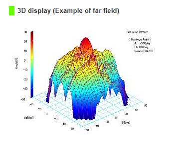 It measures in near-field, and converts the result into far-field and aperture distribution. Features: ‧Substantial contents in analysis and user interface. ‧Fast measurement ex.) 256x256 points : 30 minutes (Results depend on the performance of your vector network analyzer.)