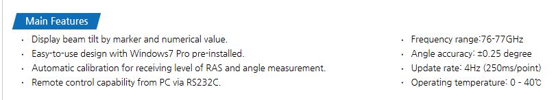KEYCOM's Radar Alignment System (RAS), SM5899, indicates the direction of the beam emitted from the radar attached to the automobile with the marker on the display as we as the up/down and left/right angle, making your alignment adjustment easy. Calibration kit, CB-01, automatically calibrates the receiving level and angle measurement.